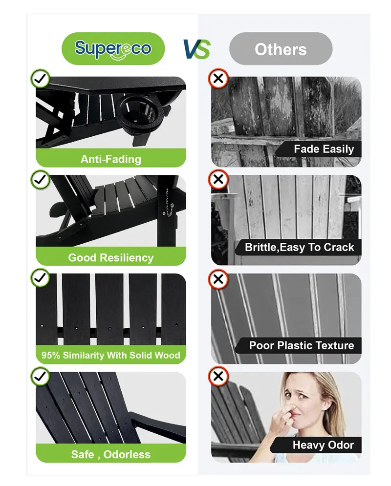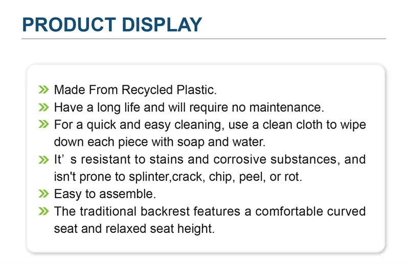| Additional Features | >> Made From Recycled Plastic. >> Have a long life and will require no maintenance. >> For a quick and easy cleaning, use a clean cloth to wipe down each piece with soap and water. >> It’s resistant to stains and corrosive substances, and isn’t prone to splinter, crack, chip, peel, or rot. >> Easy to assemble. >> The traditional backrest features a comfortable curved seat and relaxed seat height. |