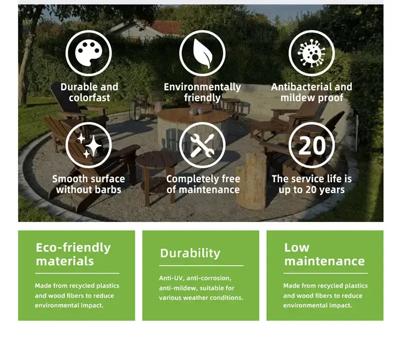 | Additional Features | Made From Recycled Plastic. Have a long life and will require no maintenance. For a quick and easy cleaning, use a clean cloth to wipe down each piece with soap and water. It’s resistant to stains and corrosive substances, and isn’t prone to splinter,crack,chip, peel, or rot. Easy to assemble. The traditional backrest features a comfortable curved seat and relaxed seat height. This small design is suitable for cross-border e-commerce. |